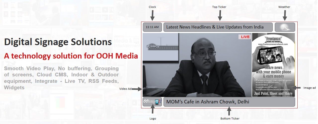 Patented and Field-tested solution for controlling digital signage solutions. Replace your content from anywhere to anywhere your screens are placed. Get a log of content that has been played. Integrate with Live camera as RSS feeds. For more information visit us at www.oohmp.com/ds.
